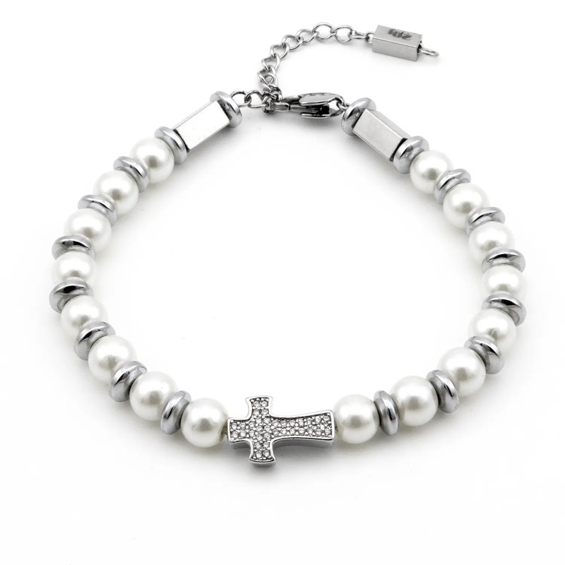 Bracciale in acciaio inox nickel free con perle bianche e croce a pavè di cristalli swarovski