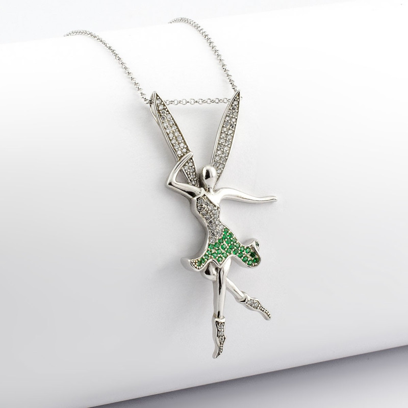 Pendente fata in argento 925 sfaccettata da cristalli swarovski bianchi e verdi, completo di catenina 45cm