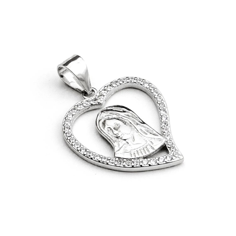 Ciondolo a cuore con il volto della Vergine Maria in argento contornato da piccoli zirconi bianchi